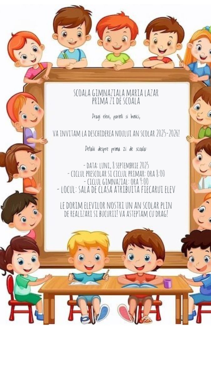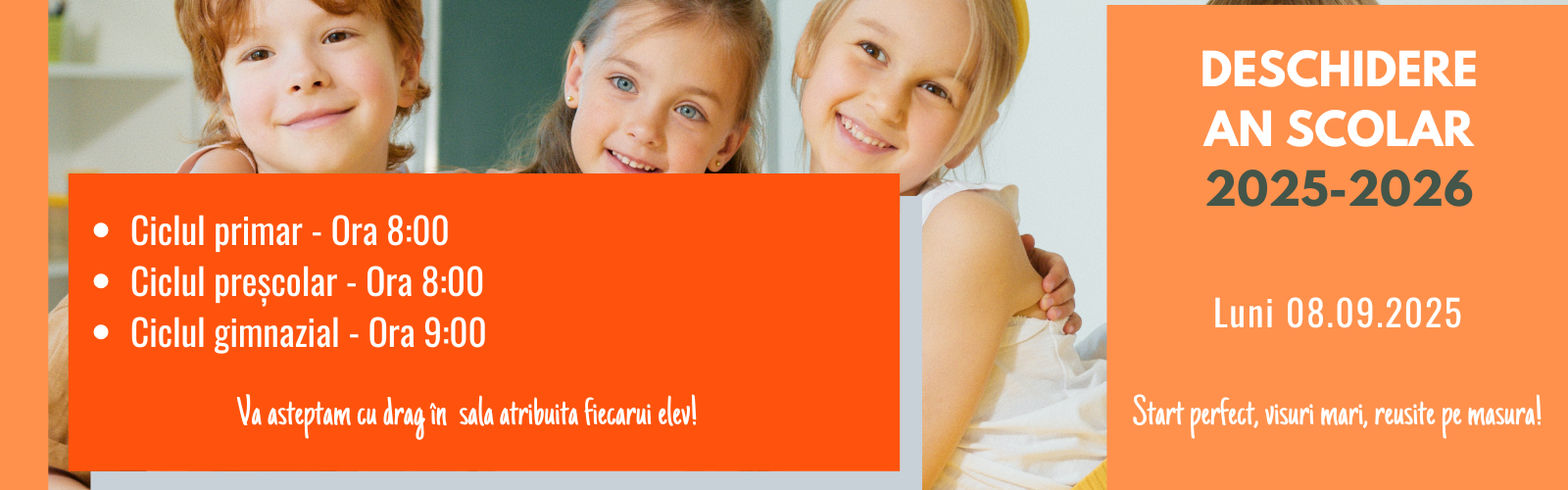 Deschiderea anului scolar 2025-2026, va avea loc LUNI, 08.09.2025 Ora 08:00 - învățământ primarOra 8:00 - învățământ preșcolarOra